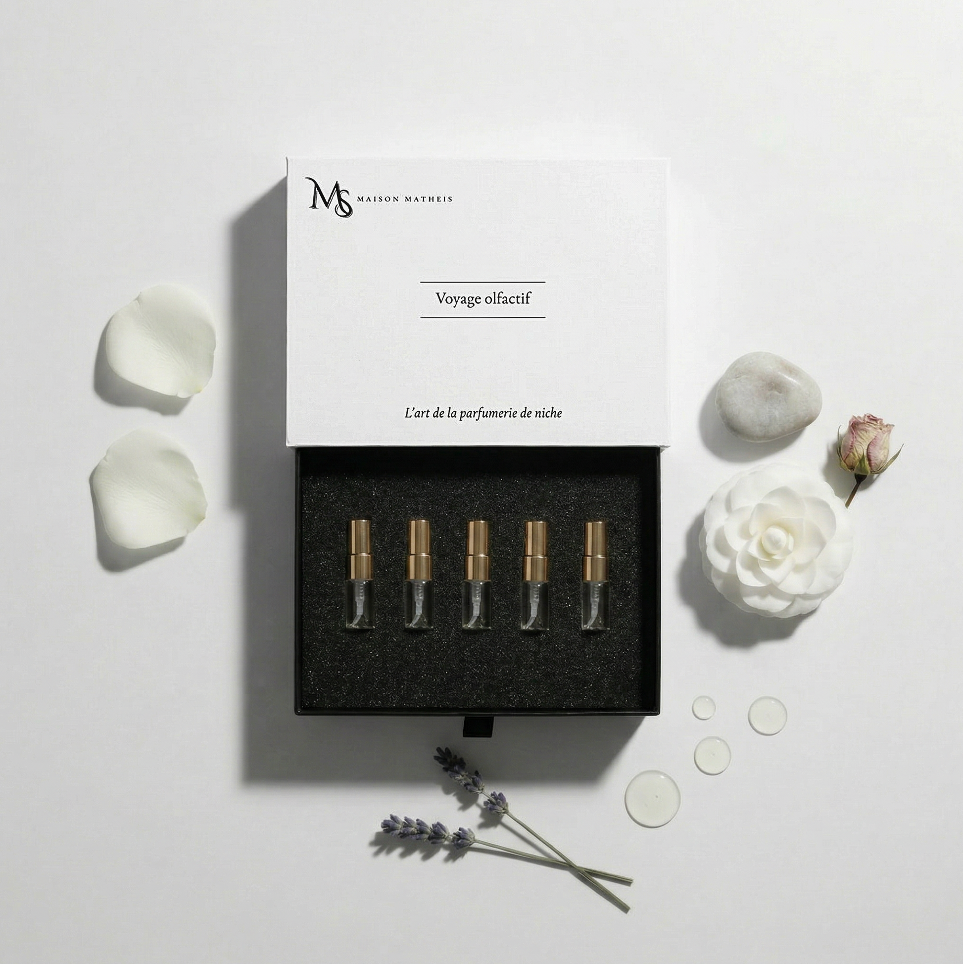 Composez votre propre voyage olfactif avec ce coffret découverte exclusif. Choisissez librement 5 échantillons de 2 ml parmi notre collection de parfums, et laissez-vous surprendre par des créations uniques qui révèlent leur personnalité au fil des heures.